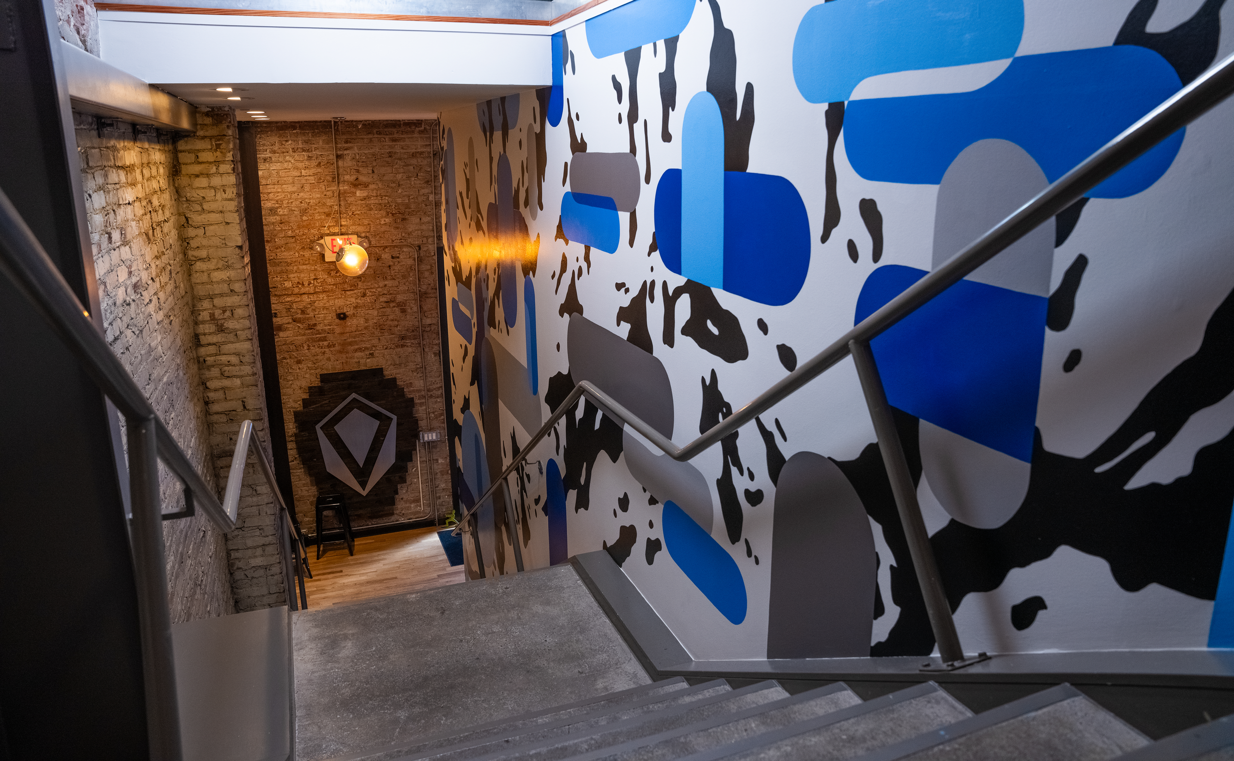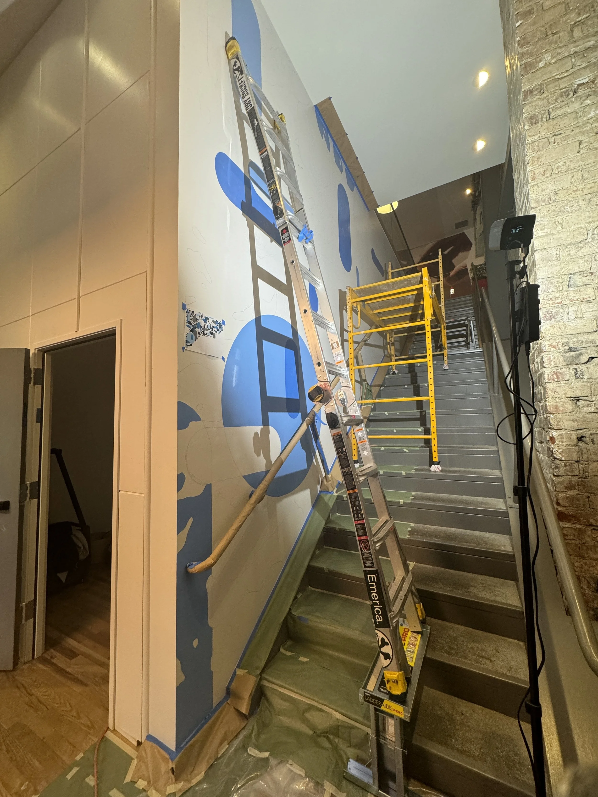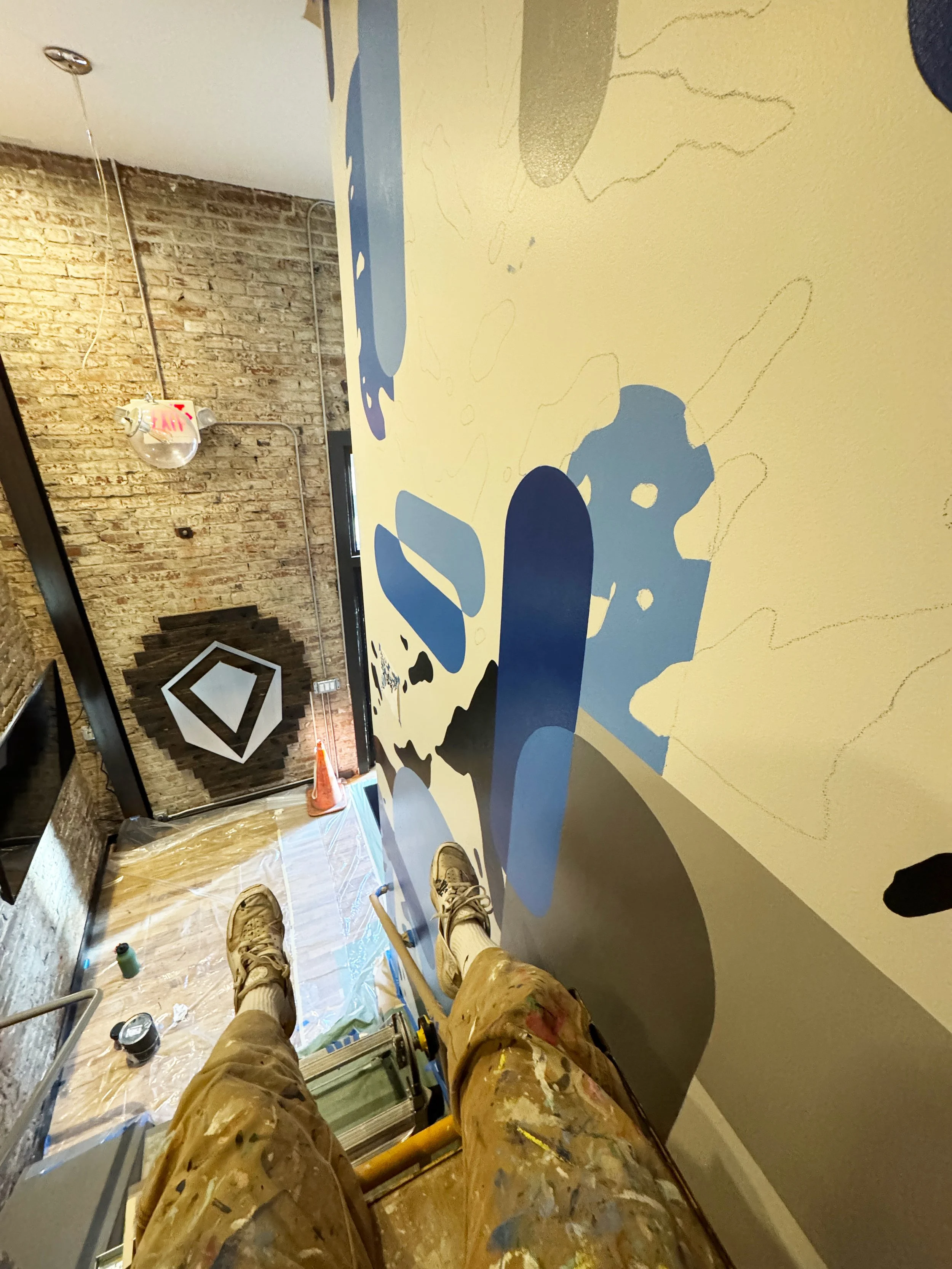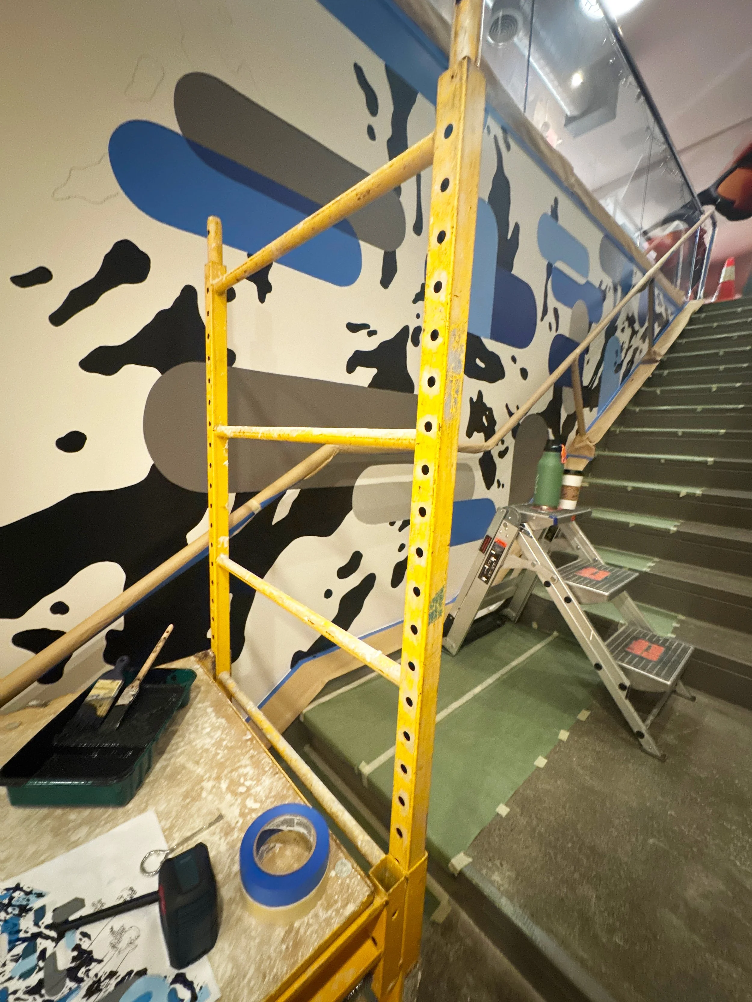 This interior mural for Revant Optics transforms a two-story staircase into a cohesive, large-scale artwork. Designed to interact with the vertical architecture, the composition features a castor bean pattern and my signature pill-shaped form, unfolding as you move through the space. The layered movement and repetition create a sense of rhythm from floor to floor, guiding the viewer upward. Located in Portland, Oregon, this custom mural highlights the impact of hand-painted work in commercial environments—blending art, branding, and spatial design into a unified experience.
